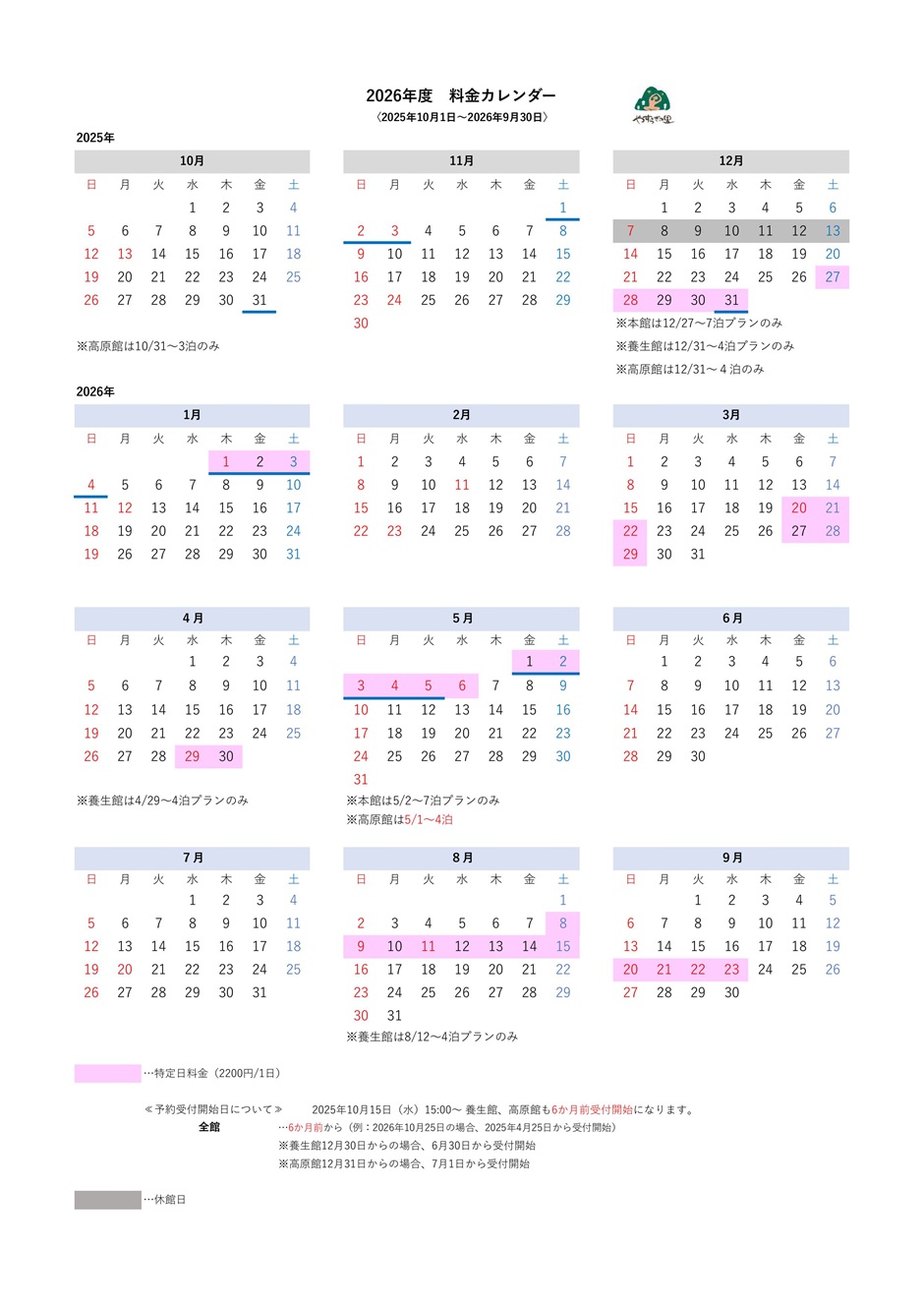 本館・養生館・高原館と滞在スケジュールが決まっています。 ご予定に合わせてご検討ください。