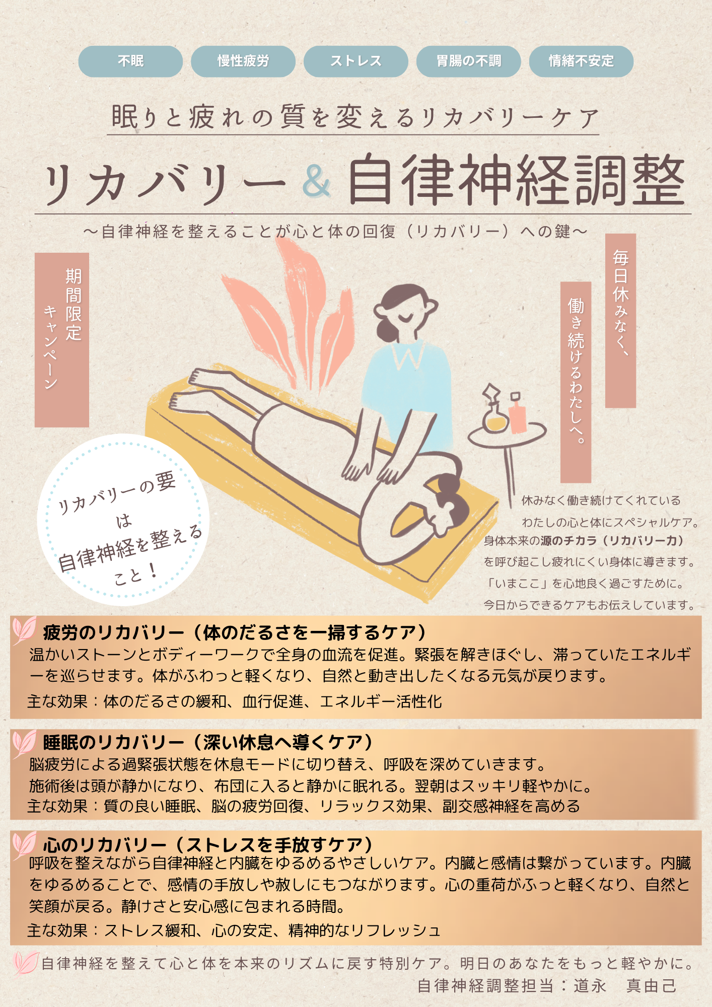 今回は、やすらぎの里でご好評をいただいている特別ケア:「リカバリー&自律神経調整」のご案内です。