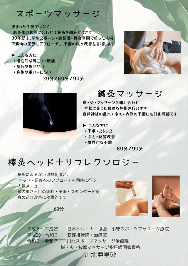 「棒灸はやりたいけどリフレクソロジーはいいからマッサージがいい」