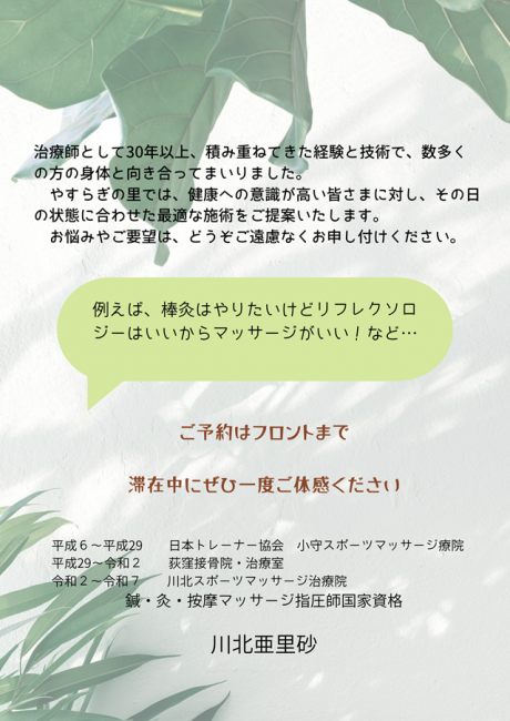 30年の技術で、体の深部から整える 鍼・灸・按摩マッサージ指圧師 国家資格 平成6〜平成29 日本トレーナー協会 小守スポーツマッサージ療院 平成29〜令和2 荻窪接骨院・治療室 令和2〜令和7 川北スポ