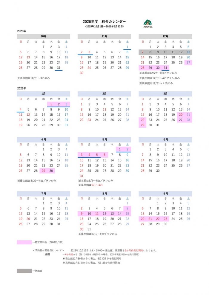 ハイシーズン料金(特定日)がプラスになる日をカレンダーでご確認いただけます。