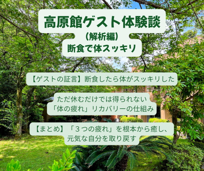 ✅ アクティビティの活用:朝日を浴びながらの散歩、呼吸法、ストレッチなど、自由参加のアクティビティが、運動不足による「体の疲れ」を心地よく解消し、断食の内面的な効果を高めてくれます。
